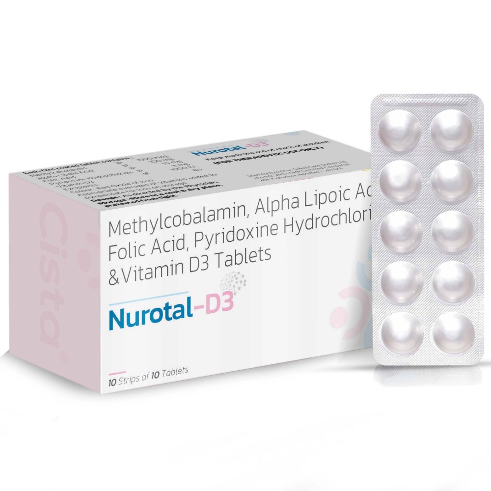 Methylcobalamin, Alpha Lipoic Acid, Folic Acid, Pyridoxine Hydrochloride & Vitamin D3 Tablets – Nurotal-D3 Tablets